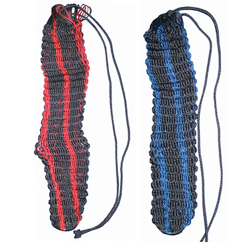 Net for hay luxury model, very strong and wide, with tight mesh. Thick resistant nylon, with small mesh, these nets limit wastage and help the horses to eat slowly. Elongated conical shape, with central loop. Size: ca.84 x 70 cm. Various colours. This net can hold up to approximately 8 kg of hay.