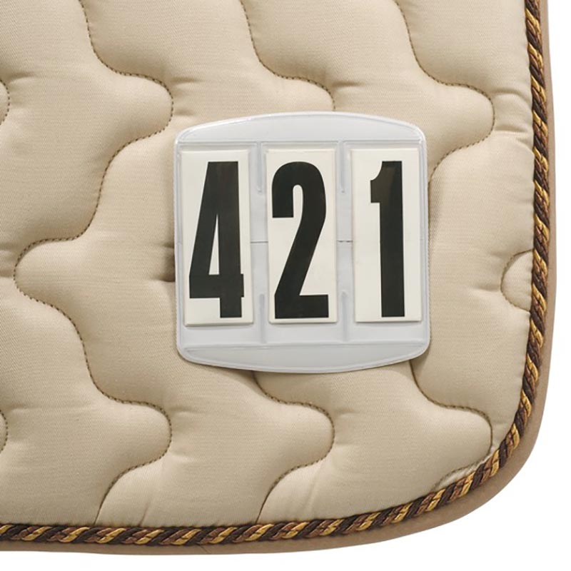 Plate for competition starting with three digit number with Velcro, for saddlecloth. Base in P.V.C. rectangular white, with 3 compartments to enter numbers. Model removable base with Velcro. Price valid for 1 pc.