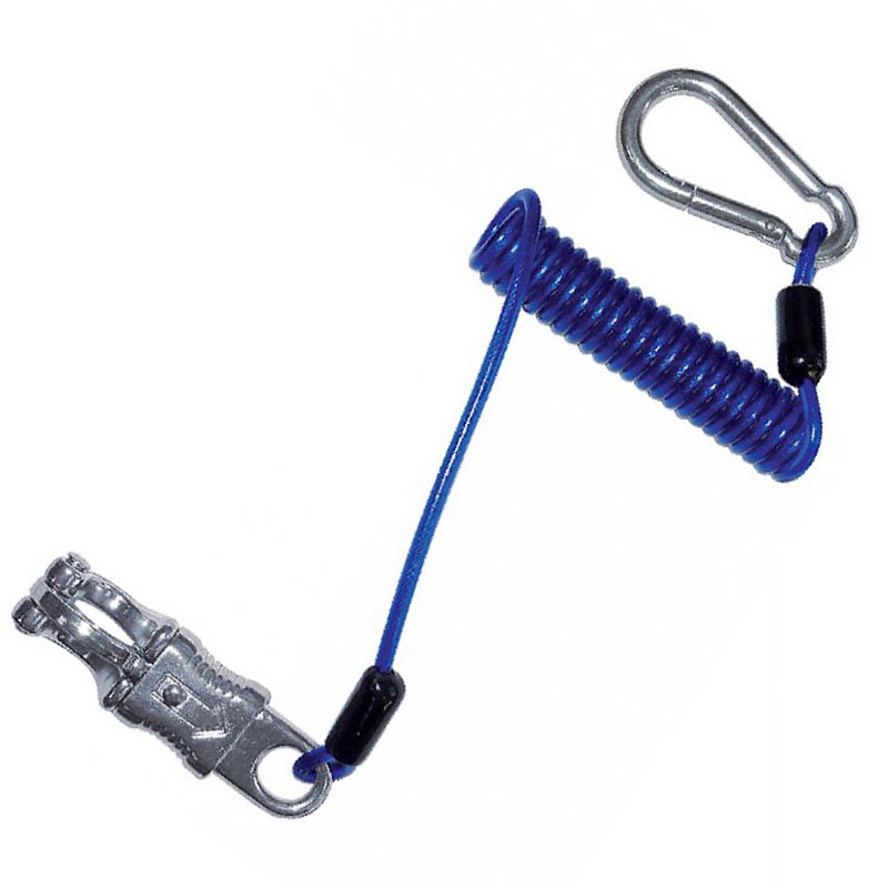 Anti Pull Back tie with Anti-Panic Spring and Carabiner With anti-panic snap to attach to headcollar and snap hook for tying ring. Spiral shaped polyurethane coated steel cable. To allow short tying with no hanging rope. Ideal for horse transportation, extends from 30 to 150 cm. With simple carabiner and anti-panic carabiner. Blue color.