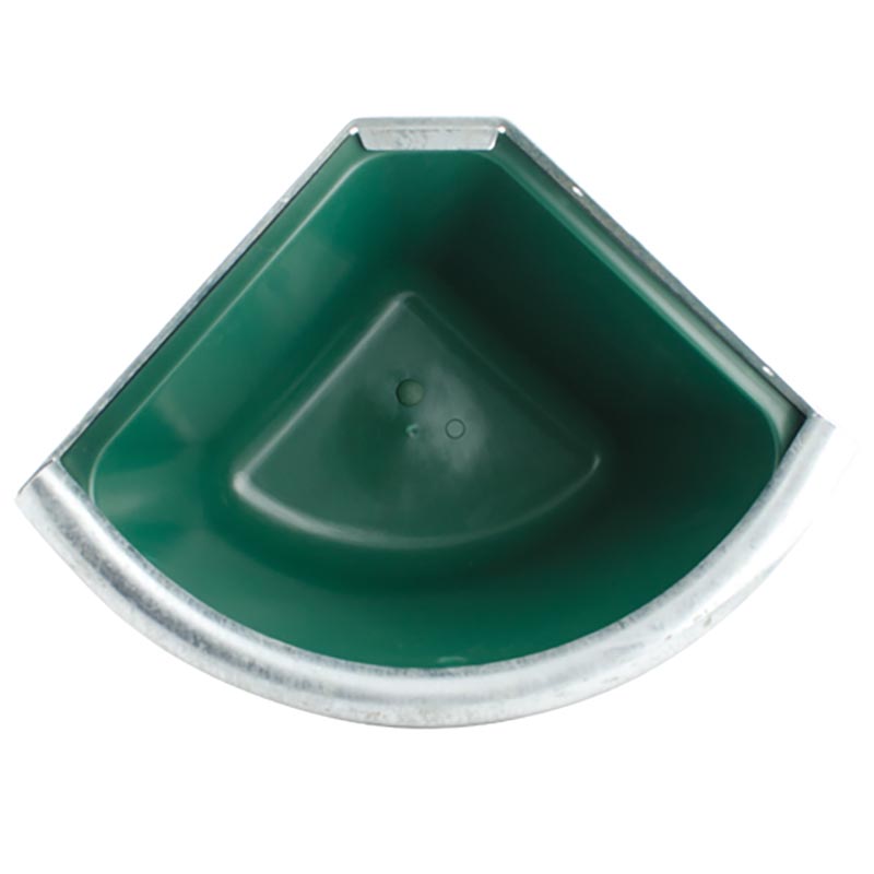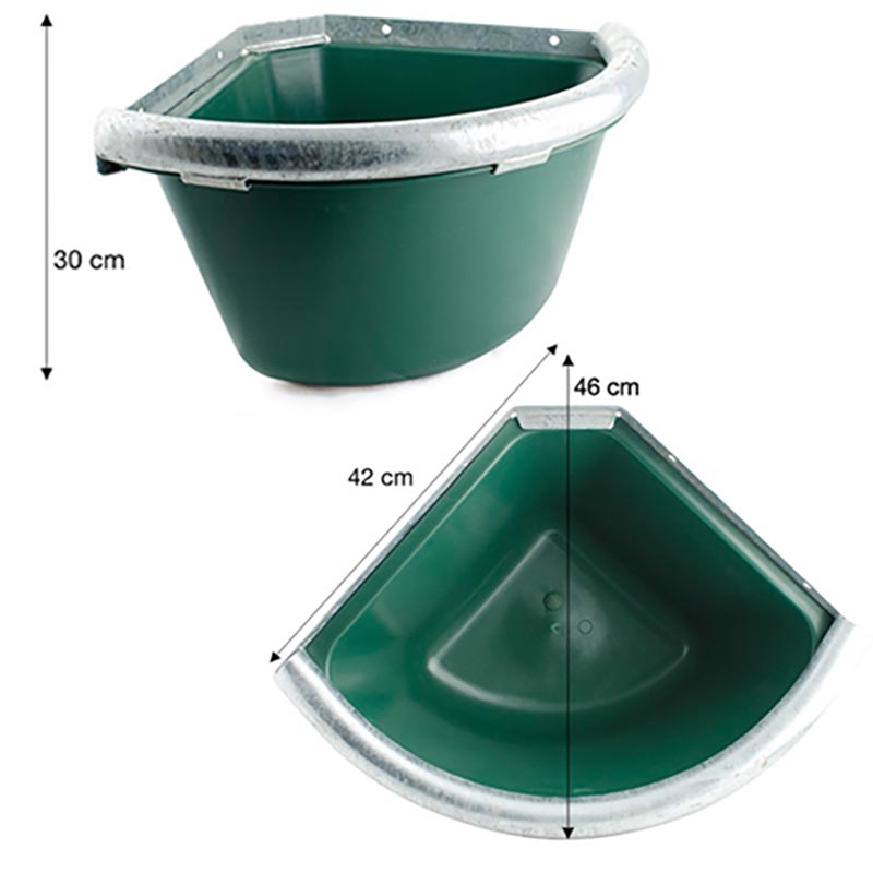 Plastic corner manger, supplied with zinc-plated anti-wasting iron border. One Colour. Capacity: 30 Liter Size: 42 x 40 x 27