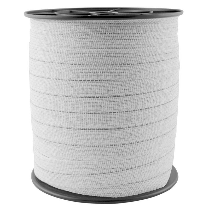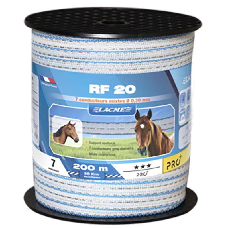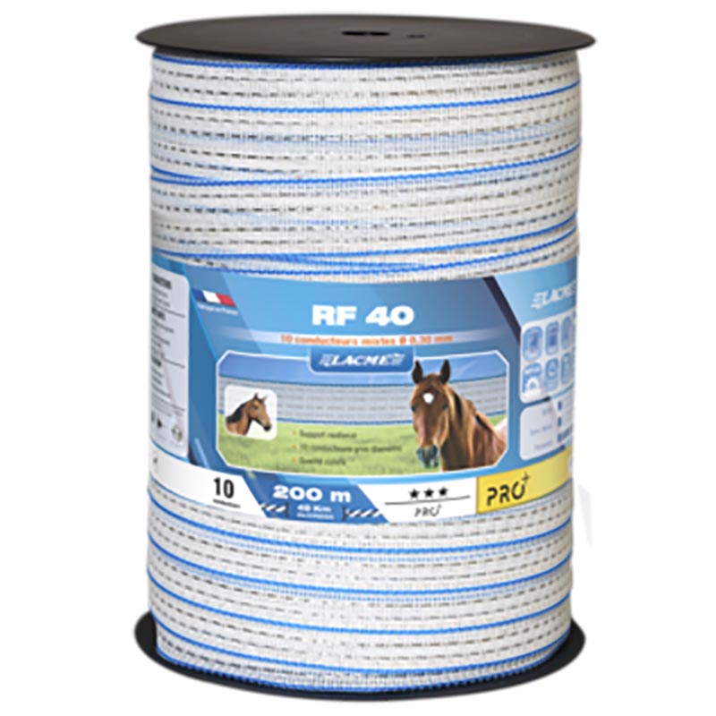 Series “RENFORCEE” composed of bands with wider threads. The plastic chain section has been multiplied by 2 and the conductor section is 50% bigger. Designed for extreme conditions: strong wind, abundant vegetation, big fences, etc. Recommended for a nice and long lasting installation. Electric band 20 mm wide, 200 mt long.