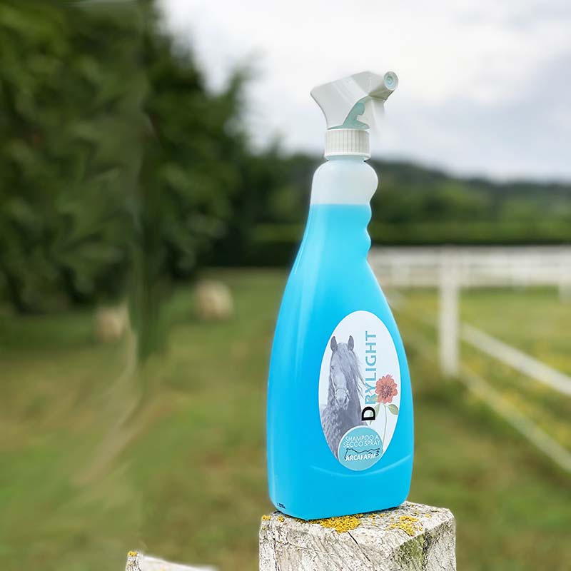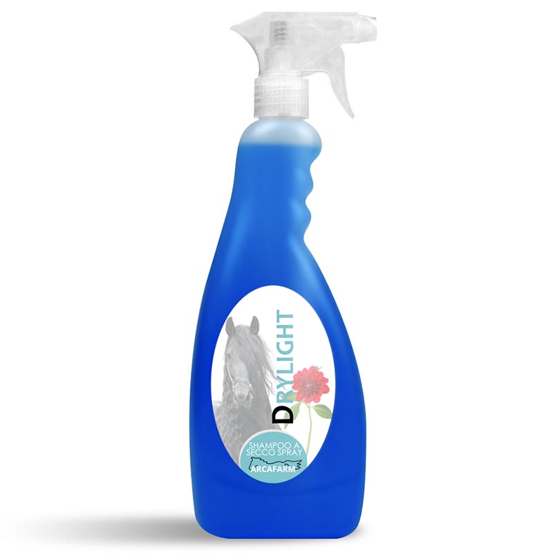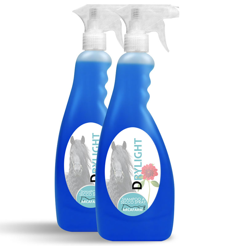 Set 2 pieces dry shampoo Arcafarm Drylight. Convenient package of 2 pieces of dry shampoo spray Drylight Arcafarm. 2 bottles of 750 ml. Practical in all occasions where we cannot thoroughly wash the horse, also excellent on horses with white or gray coat, to remove yellow stains. It cleans the hair, making it light and fluffy, and leaves a delicate and pleasant fragrance. Supplied with sprayer.