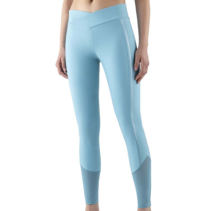Women’s high-waist equestrian leggings with knee grip, Gesrikh Glamour model, made from BX-Tech technical fabric with Knee Grip system. The Equiline Gesrikh leggings are designed with high-tech, premium materials to ensure top-level performance during training and competitions. The BX-Tech fabric is stretchy yet durable, making it ideal for daily use and all seasons. This high-waist model, featuring a V-shaped waistband and inner grip, provides a perfect fit that follows body movements in the saddle while enhancing the silhouette. The knee grip system improves stability while riding. The high-waist Equiline leggings are enriched with micro-perforated (stretch tulle) inserts on the phone pocket and ankle, as well as small rhinestones along the leg and on the decorative logo at the waist. • BX-Tech 4-season fabric, stretch and breathable • High-waist with V-shaped design, for a perfect fit • Phone pocket on the leg, ideal for smartphones or small essentials • Tulle stretch and rhinestone details, for an elegant and sporty touch