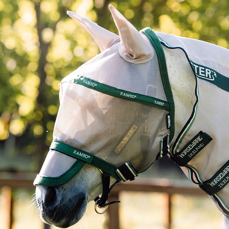 Fly mask net Horseware model Rambo Plus. The most effective and lasting ear net Horseware. Durable, soft and comfortable for the horse grazing. Protects from insects and sunlight, the edges are coated with soft anti-rubbing fleece. Adjustable Velcro closures, the space is ample for the ears, improved design for eye protection.