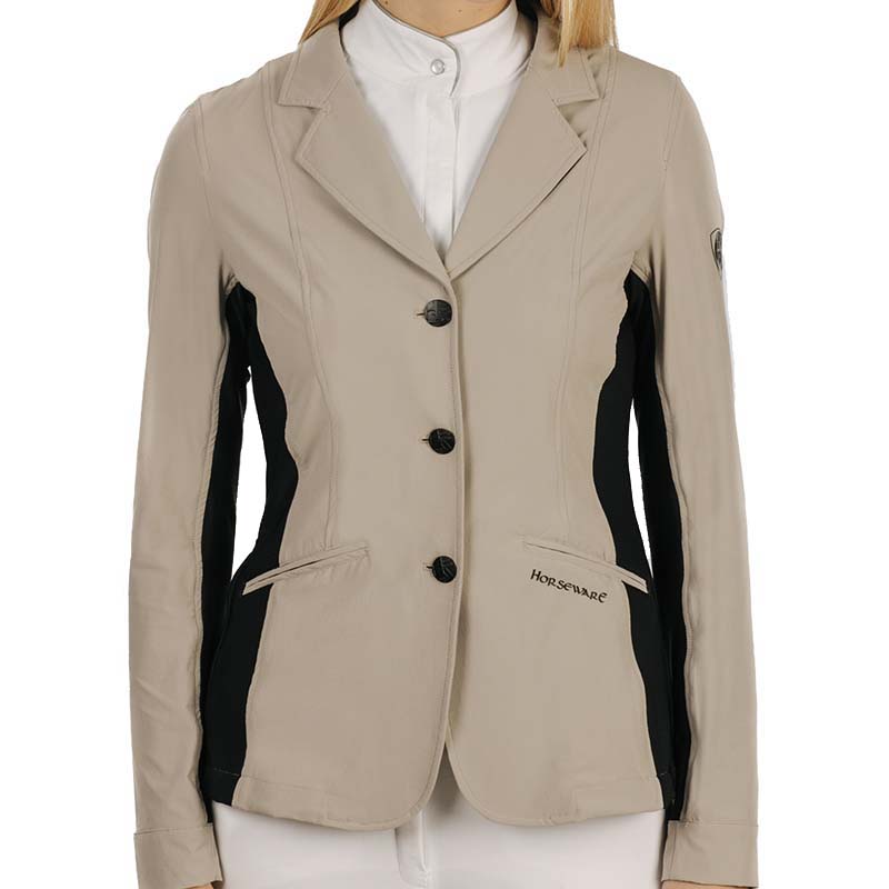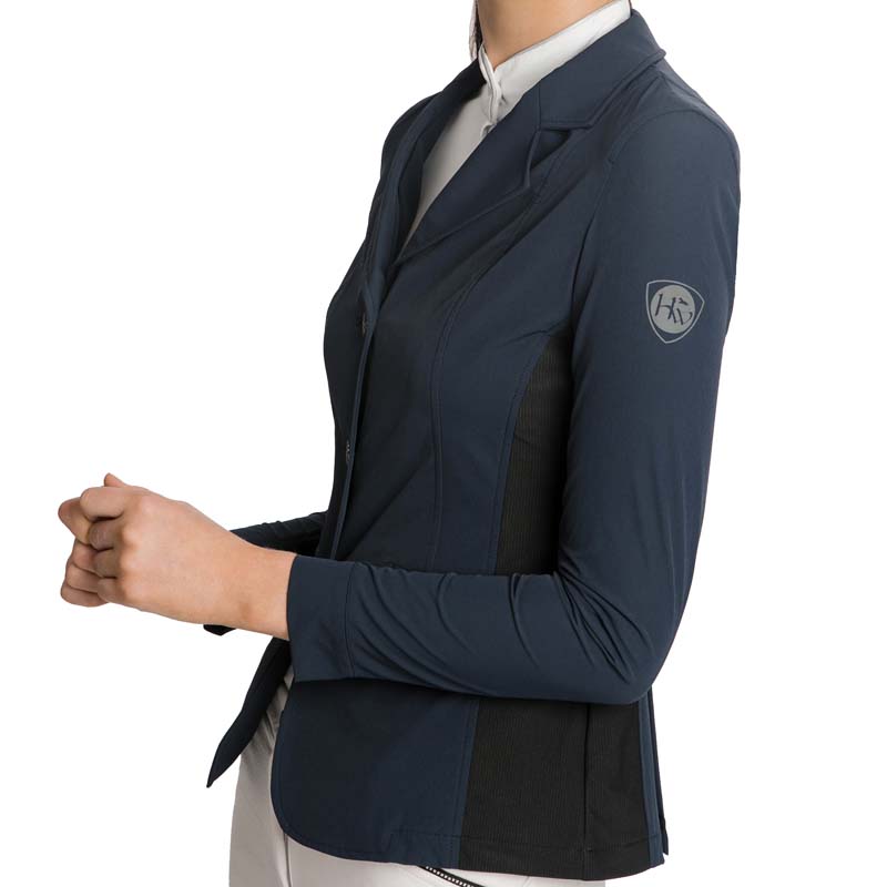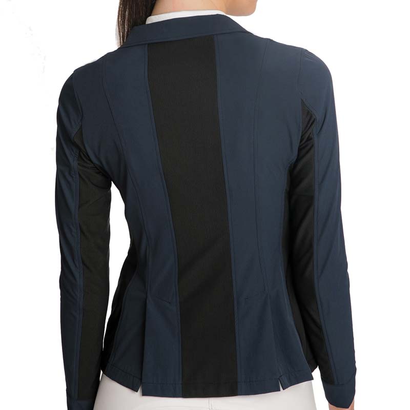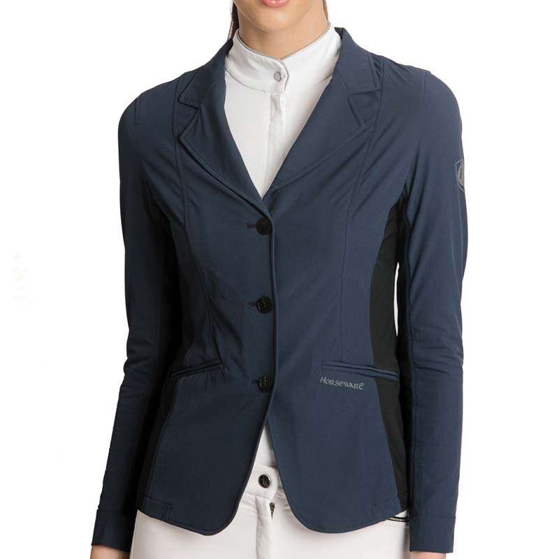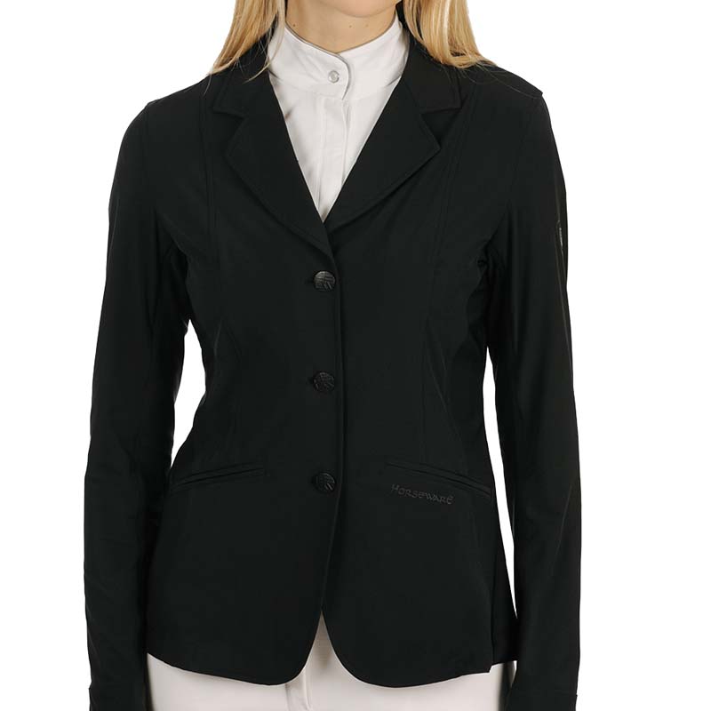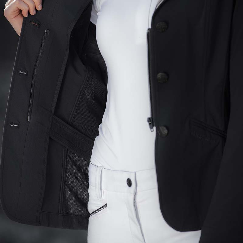 Horseware ladies competition jacket, Air MK2 model. Lightweight second skin competition jacket for riding, light model for summer, with inserts in breathable and thermoregulator mesh. Technical fabric with 4-Way stretch fibers, concealed zip fastening, HW matt black branded buttons, machine washable. 85% nylon, 15% spandex.