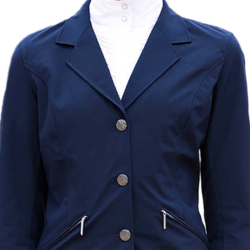 Competition jacket women slightly and stretchy softshell Horseware. Slim fit. Machine washable, breathable and water resistant up to 3000 ml. Practical pockets closed by zippers, buttons are custom Horseware. 85% Polyester, 3% Spandex, 12% PU.