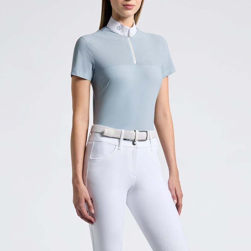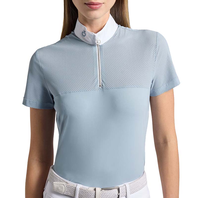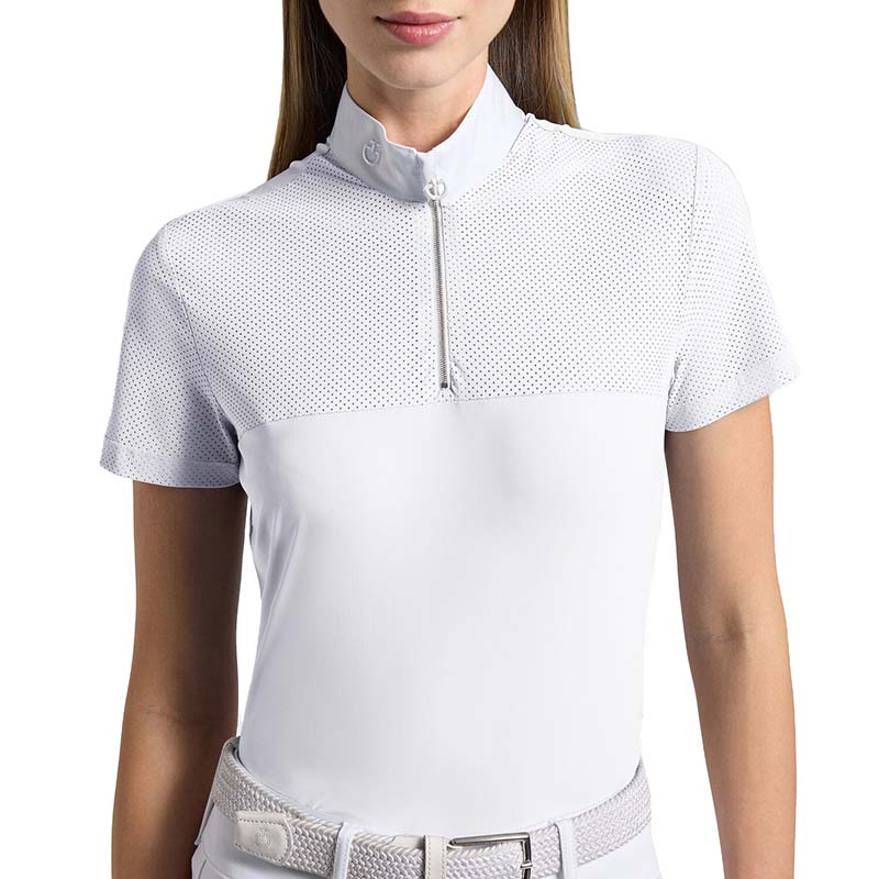 Short-sleeved women's competition polo from the New Cavalleria Toscana Collection, made of lightweight technical fabric with perforated jersey inserts for maximum breathability and comfort during competitions. This competition shirt is a Made in Italy garment, crafted with premium fabrics and refined details. The perforated jersey panel on the upper part helps regulate body temperature and ensures optimal comfort, even during high-level competitions. The lightweight, form-fitting technical fabric offers a flawless fit, while the white cotton collar is embellished with an embroidered CT logo. • Technical equestrian competition polo with short sleeves, ideal for English riding • Lightweight technical fabric with perforated jersey inserts, highly breathable and quick-drying • White poplin collar with invisible zip closure • Cavalleria Toscana logo on the collar and back Item excluded from Return: this item on sale or on promotion cannot be exchanged, replaced or refunded.