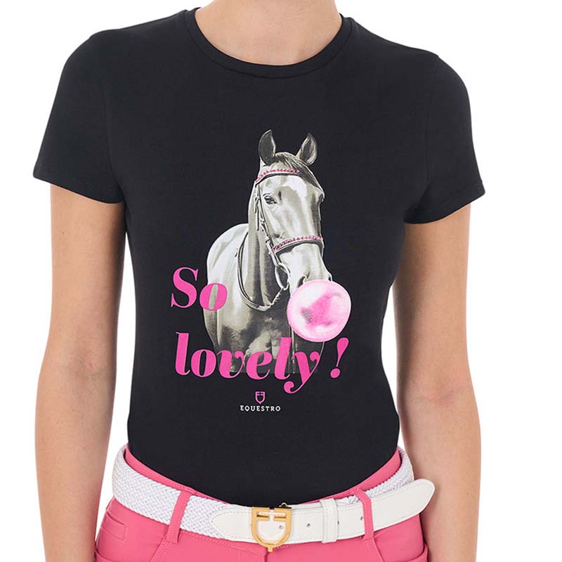 Equestro cotton t-shirt for women/girls with a fun horse print and "So Lovely!" lettering. This short-sleeved t-shirt is perfect for equestrians who want to combine their passion for horse riding with a touch of humor in their style. The unique graphic features a horse wearing a decorated browband and blowing a large pink bubble gum, adding a playful and trendy look. Made from lightweight and breathable cotton, the Equestro "So Lovely" t-shirt is ideal for days at the stable, leisure time, or a casual outfit with an equestrian vibe.