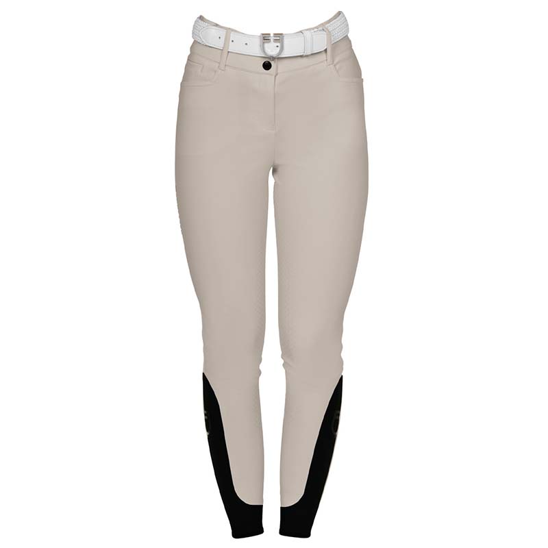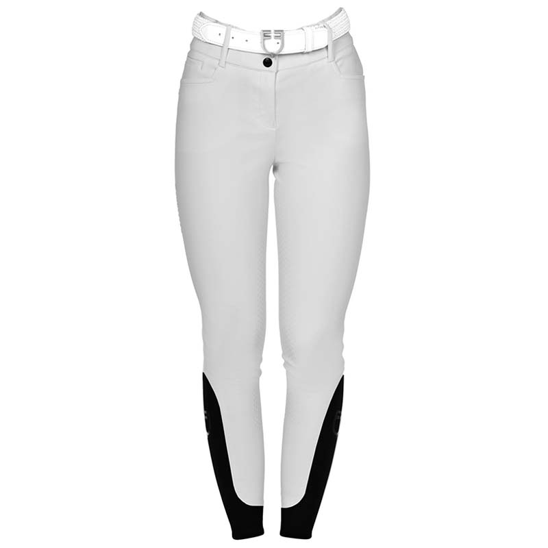 The Equestro women’s riding breeches are a classic and elegant model with a high waist and full silicone grip, enhanced with rhinestone details on the belt loops. Available in various colors such as white, black and blue, they are suitable for both training and English riding competitions.
