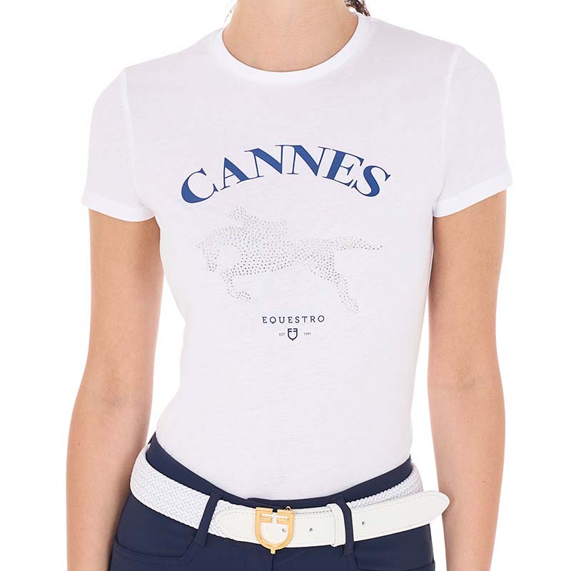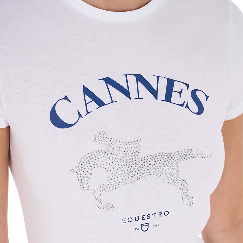 • Equestro t-shirt for women and girls, short-sleeved, made of breathable cotton with "Cannes" print and a stylized horse design in rhinestones.