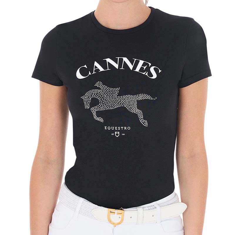 Elegant yet sporty, this Equestro t-shirt is perfect for leisure time and days at the stables. The design is enhanced by the classic "Cannes" lettering and a sparkling decoration featuring a horse and rider in rhinestones.